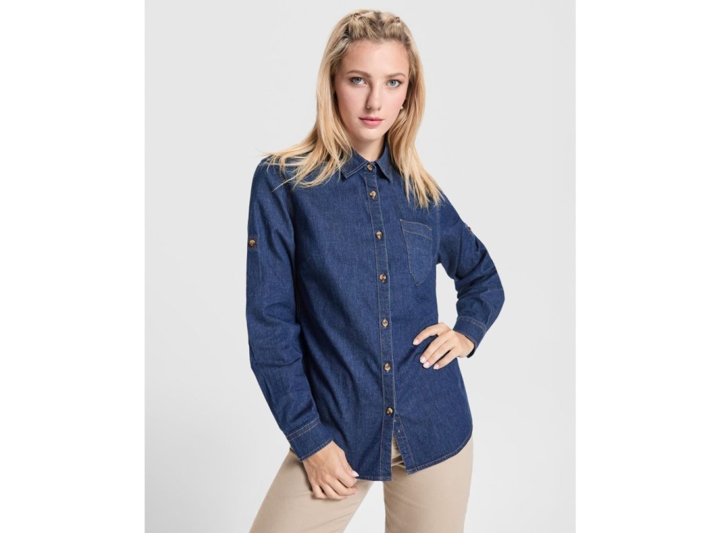 Dámská džínová košile s dlouhým rukávem a nastavitelným poutkem na opasek. Strečová tkanina. Mírně přiléhavý pas.·Košilový límec. Přední ramenní švy a zadní sedlo. Kapsa ve tvaru V na levé straně hrudníku. Manžety s dvojitým knoflíkem a záhyby a další malý knoflík na manžetové léze. Záševky na hrudi a zádech. Zaoblené lemy.