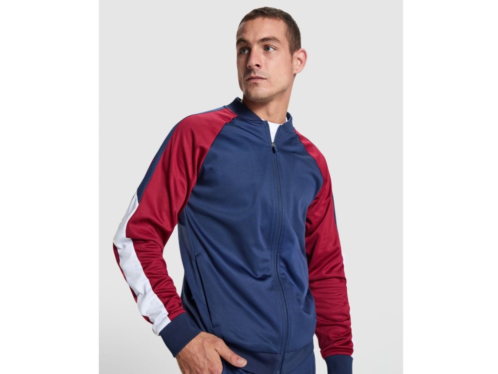 Sportovní bunda s raglánovými rukávy. Zapínání na zip na přední straně. Dvě boční kapsy se zapínáním na zip. Límec, manžety a lem s žebrováním 1x1. Kontrastní podlepený výstřih. Kontrastní rukávy s pruhy podél rukávu. Barevné varianty ladící s kalhotami URUS.