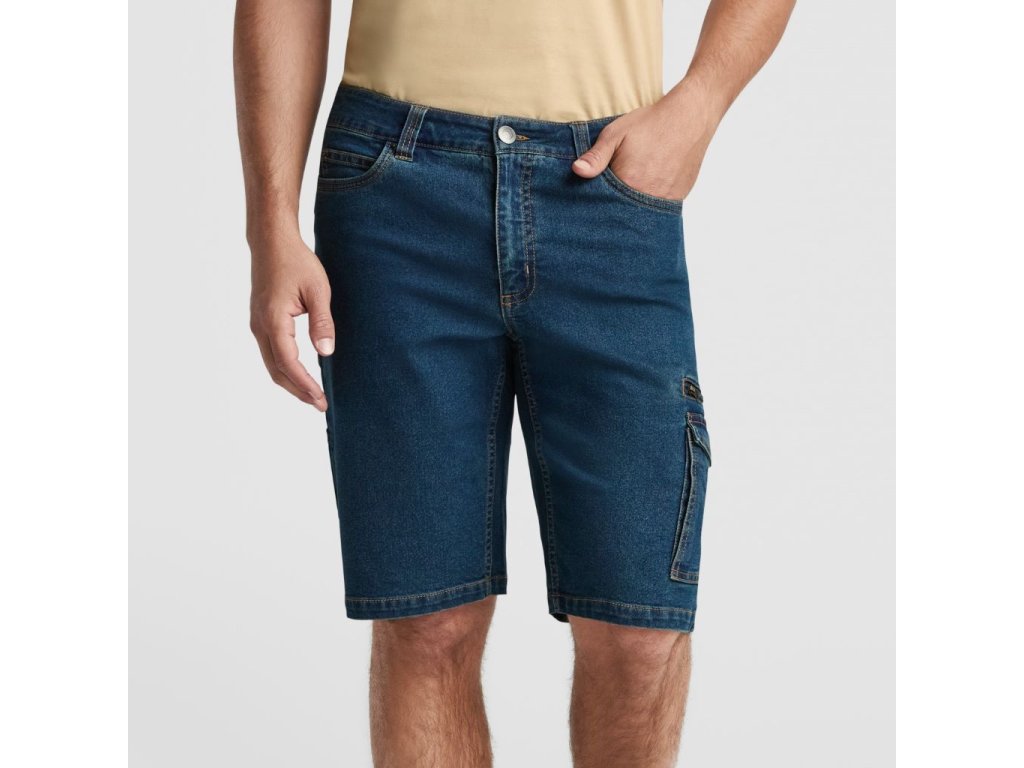 Džínové šortky s více kapsami. Odolná elastická tkanina. Pas s poutky na opasek. Dvě přední bederní kapsy s kapsou na mince na pravé straně. Dvě zadní kapsy. Pravá zadní kapsa s klopou a zapínáním na suchý zip. Integrovaná cargo kapsa se zapínáním na zip. Prodloužená víceúčelová kapsa na levé noze. Vnější štítek Roly WRK.