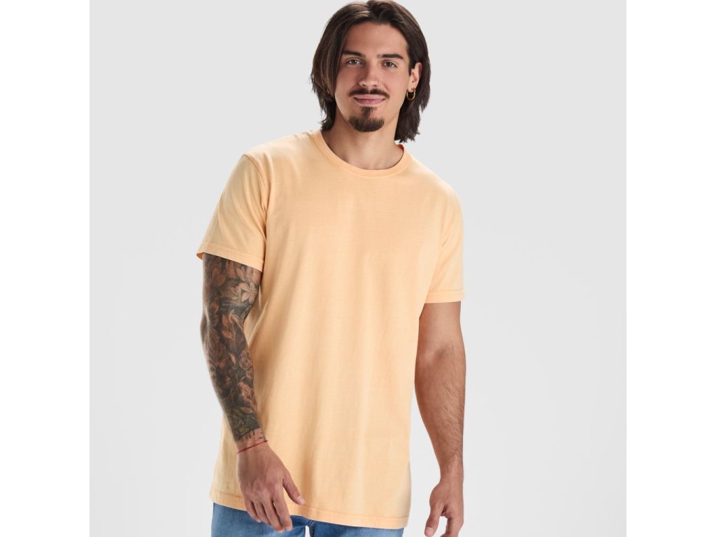 Pánské tričko s krátkým rukávem. Česaná bavlna s vypraným efektem. Kulatý výstřih s žebrováním 1x1. Podlepený výstřih ze stejného materiálu. Dvojité švy na bocích a v podpaží.