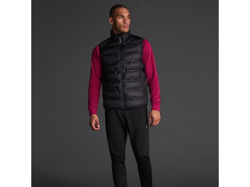 Unisex lehká polstrovaná sportovní vesta s výplní z materiálu, který na dotek připomíná peří, z tkaniny z recyklovaného polyesteru, polyamidu a s tepelně zataveným designem. Větru odolná.